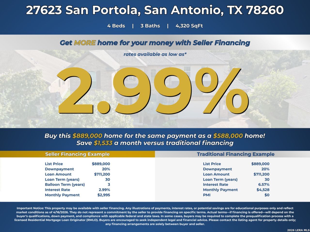 ***Buy this $889,000 home for the same payment as a $587,000 home! MAXIMIZE YOUR BUYING POWER with exclusive seller financing! Well qualified buyers can lock in rates from the high-2s to mid-3s, depending on down payment, and save up to $41K in closing costs. Minimum 10% down payment. All buyers must be pre-approved through a licensed RMLO to be considered. No formal underwriting, no discount points, close in as little as 14 days.*** Exceptional 5BD/4BA home in a prestigious gated community on a private .7-acre lot. Soaring entry ceilings, dual Juliet balconies & double-sided fireplace make a stunning first impression. 1st-floor primary suite w/ 2 walk-in closets & spa ensuite. 2nd BR on main level ideal for guests or multi-gen living. Dedicated office, large loft & flex room offer endless versatility. Resort-style backyard features custom pool w/ beach entry, hot tub, screened patio w/ fireplace & fully equipped outdoor kitchen - all surrounded by mature trees for ultimate privacy. New roof (2019), full HVAC replacement of one AC unit w/ updated ductwork (2024). Walk to nearby Bullis County Park & Timberwood Park Elementary school. Seller financing available - dont miss this one.