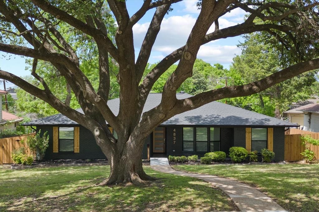 Welcome to this updated modern Ranch-Style home in the established Buckner Terrace neighborhood close to Downtown Dallas and White Rock Lake. Nestled on a large, tree-shaded lot, this beautiful home blends modern with classic design. This meticulously renovated 4 bedroom, 2.5 bath home offers timeless appeal with impeccable detail. Thoughtfully redesigned with functional living in mind, the home features an open and inviting layout. Once inside, you’re greeted with hand-scraped hardwood floors throughout. The formal living and dining spaces are filled with natural light, creating a comfortable setting perfect for entertaining and gatherings. The family room features vaulted beamed ceilings, wood floors, built-in entertainment center, a brick fireplace, and custom cabinetry with integrated lighting and wine racks. The chef’s kitchen flows seamlessly and offers quartz counter-tops, Waterfall peninsula, custom cabinets and hardware, stainless steel appliances including a gas range, touchless vented hood, three ovens, microwave, porcelain Farmhouse sink, and a well appointed entertainer’s pantry with wine refrigerator. The primary bedroom is a relaxing retreat with hand-scraped woods and custom barn door leading into a spa-inspired ensuite with tiled floors and walls, frameless glass shower with a rainfall shower head system, dual sinks with custom cabinets and hardware, touch sensor mirrors, free-standing soaking tub, and a WIC. Three additional bedrooms provide flexible living options, perfect for home office, guests, or hobbies and a tastefully updated guest bathroom in the hall with modern finishes. The oversized backyard provides the perfect setting for outdoor living with a covered patio, 8 ft privacy fence with a automatic gate, and modern LED soffit lights showcasing the home’s exterior. Perfectly located close to Baylor Medical Center, Dallas Arboretum, Tension Park Golf Course, Dallas Love Field, Downtown Dallas, White Rock Lake, and major highways.