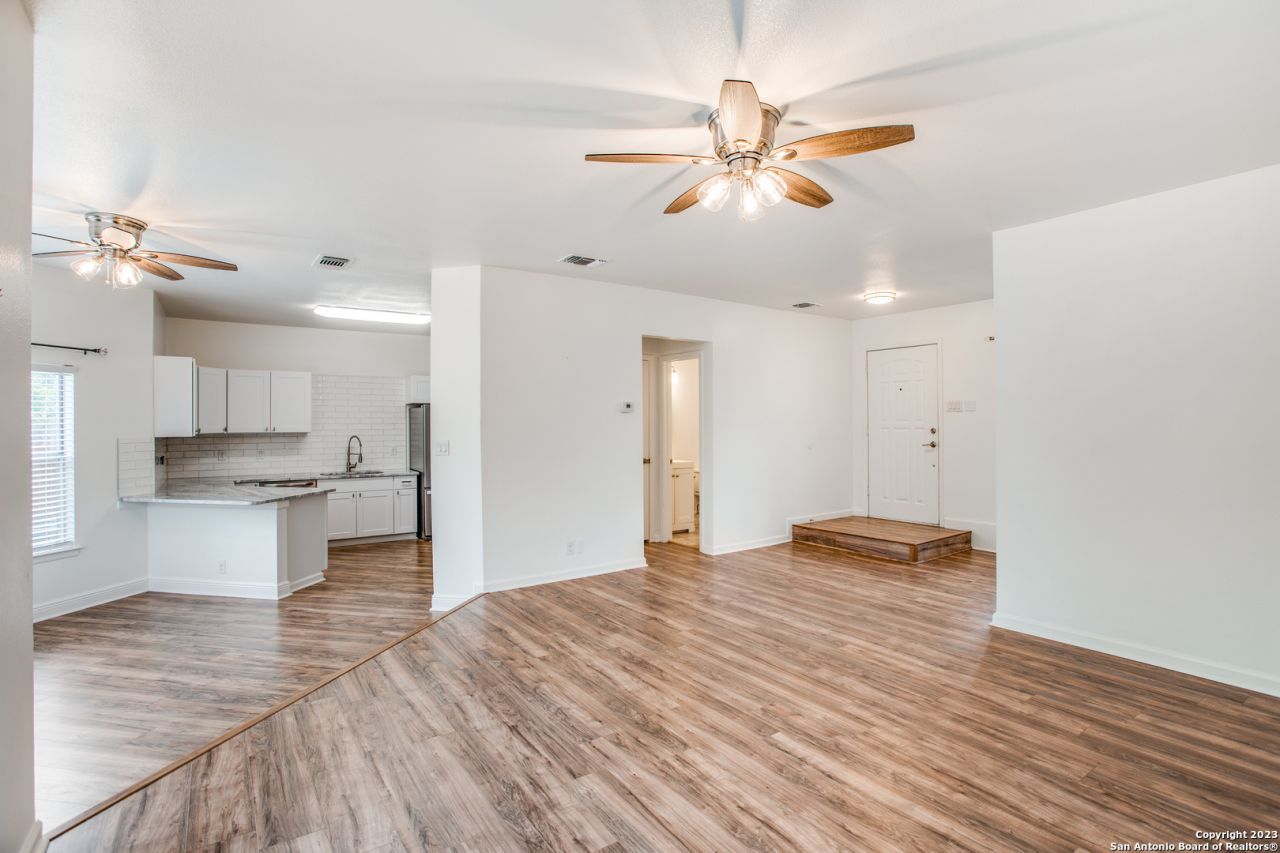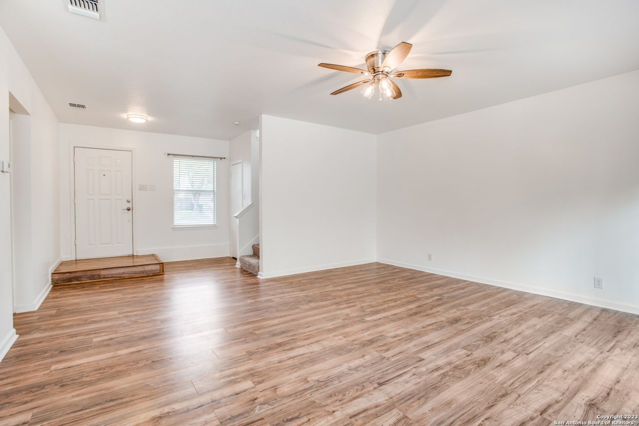 Welcome to this gorgeous two-story home in Hunters Ranch, where comfort and convenience come together. The open floor plan features wood flooring throughout the main level, leading you down into a well-appointed kitchen and breakfast nook with white tile backsplash, marble countertops, ample cabinet space, and stainless steel appliances-including the refrigerator and reverse osmosis system. The oversized primary bedroom offers a relaxing retreat with a large walk-in closet and an ensuite bath with a single vanity and tub/shower combo. Washer and dryer are included for added ease. Step outside to a spacious backyard with a privacy fence, perfect for entertaining or unwinding at the end of the day. Enjoy a short walk to neighborhood amenities such as the community pool, sand volleyball court, pavilion with grills, and basketball court. Conveniently located near major highways, UTSA, USAA, La Cantera, Fiesta Texas, and a variety of shopping and dining options. Pets over two years of age considered.