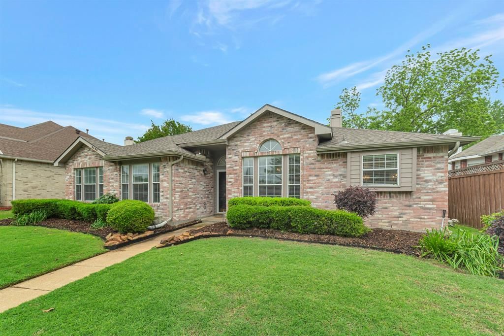 From the moment you arrive, the lush manicured lawn, mature trees, and warm brick exterior set the tone for everything waiting inside. Step through the front door and you're greeted by rich hardwood floors, soaring ceilings, and a layout that immediately feels both spacious and inviting. The living room centers around a charming whitewashed brick fireplace, the perfect gathering spot, while an arched passageway flows seamlessly into the dining area with its elegant chandelier and natural light. The kitchen is a true workhorse with white cabinetry, granite countertops, a travertine tile backsplash, and stainless steel appliances. The primary suite is your private retreat, featuring vaulted ceilings and windows framing serene backyard views. The en-suite bath has been beautifully updated featuring a deep soaking tub and a frameless glass shower with designer tile and matte black fixtures. Secondary bedrooms are comfortable and bright, served by an updated full bath with matching granite and black hardware finishes. Out back, a covered patio with a louvered aluminum pergola invites year-round outdoor living, overlooking a fully fenced yard shaded by a magnificent mature tree. Perfectly positioned with easy access to I-30 and George Bush Turnpike, this Rowlett gem puts you minutes from Lake Ray Hubbard's scenic waterfront parks and trails, Firewheel Town Center, shopping, and dining all while enjoying the charm of an established neighborhood